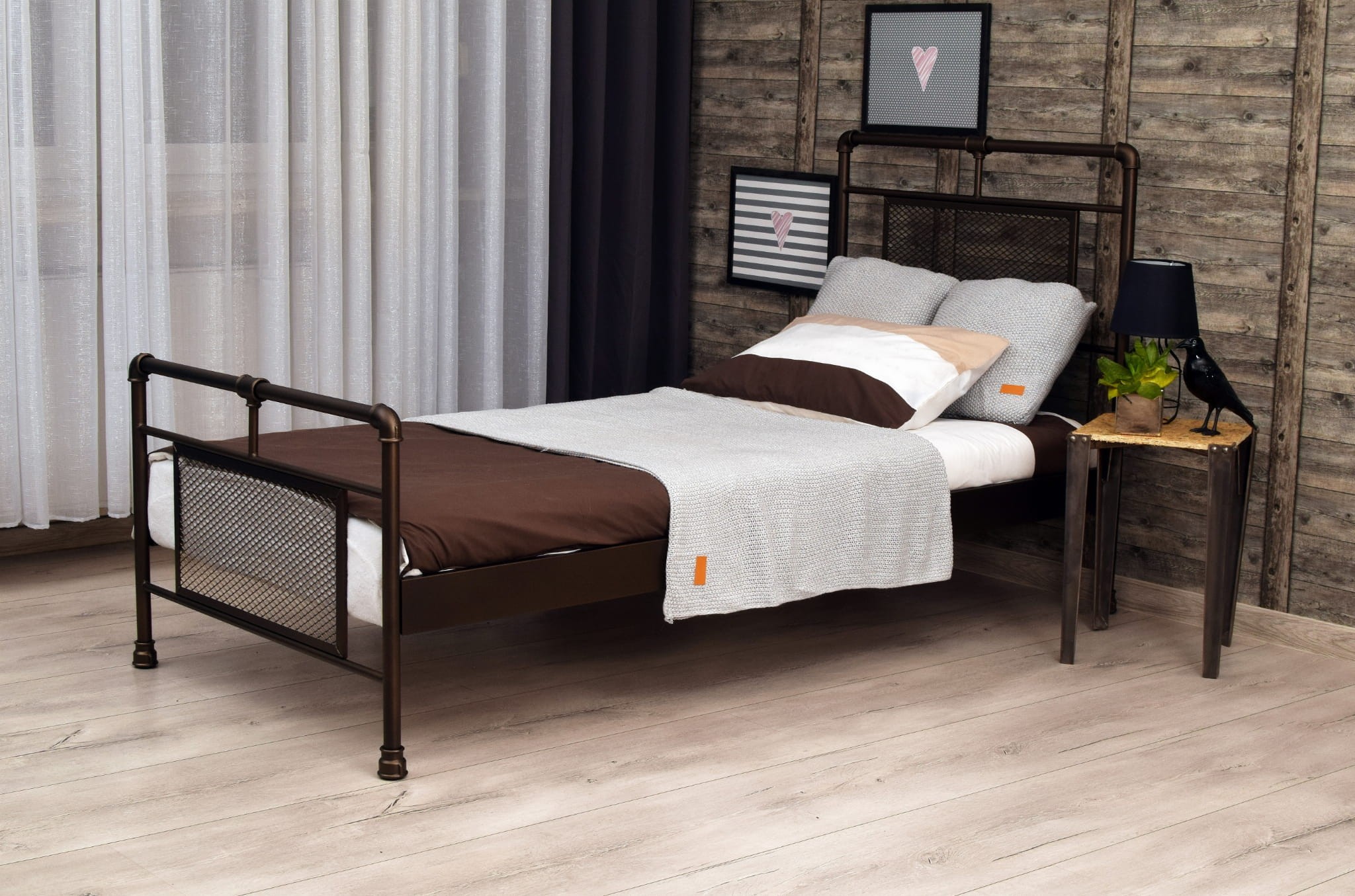 Mocna metalowa rama pojedynczego łóżka w stylu loftowym zapewni głęboki spokojny sen.