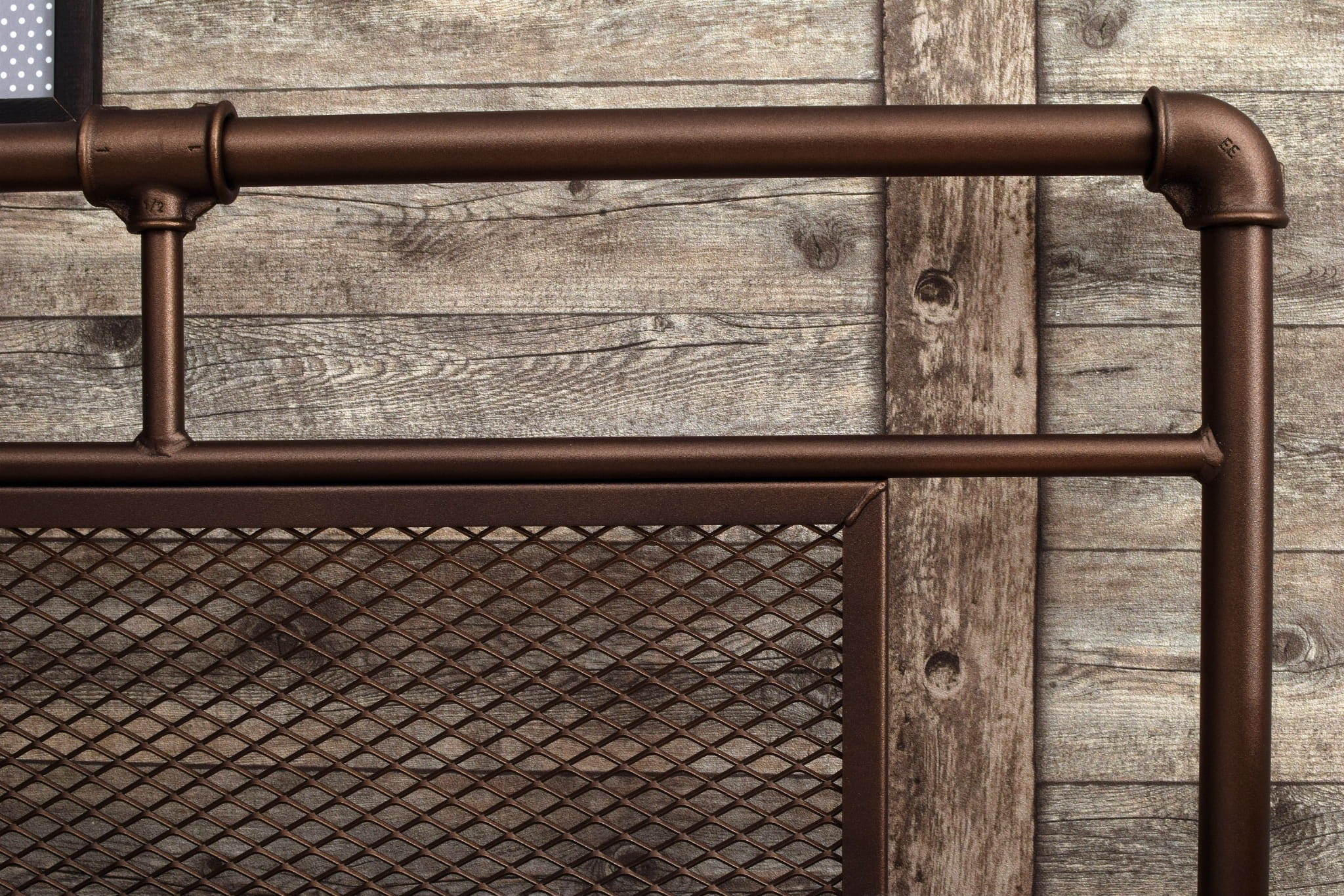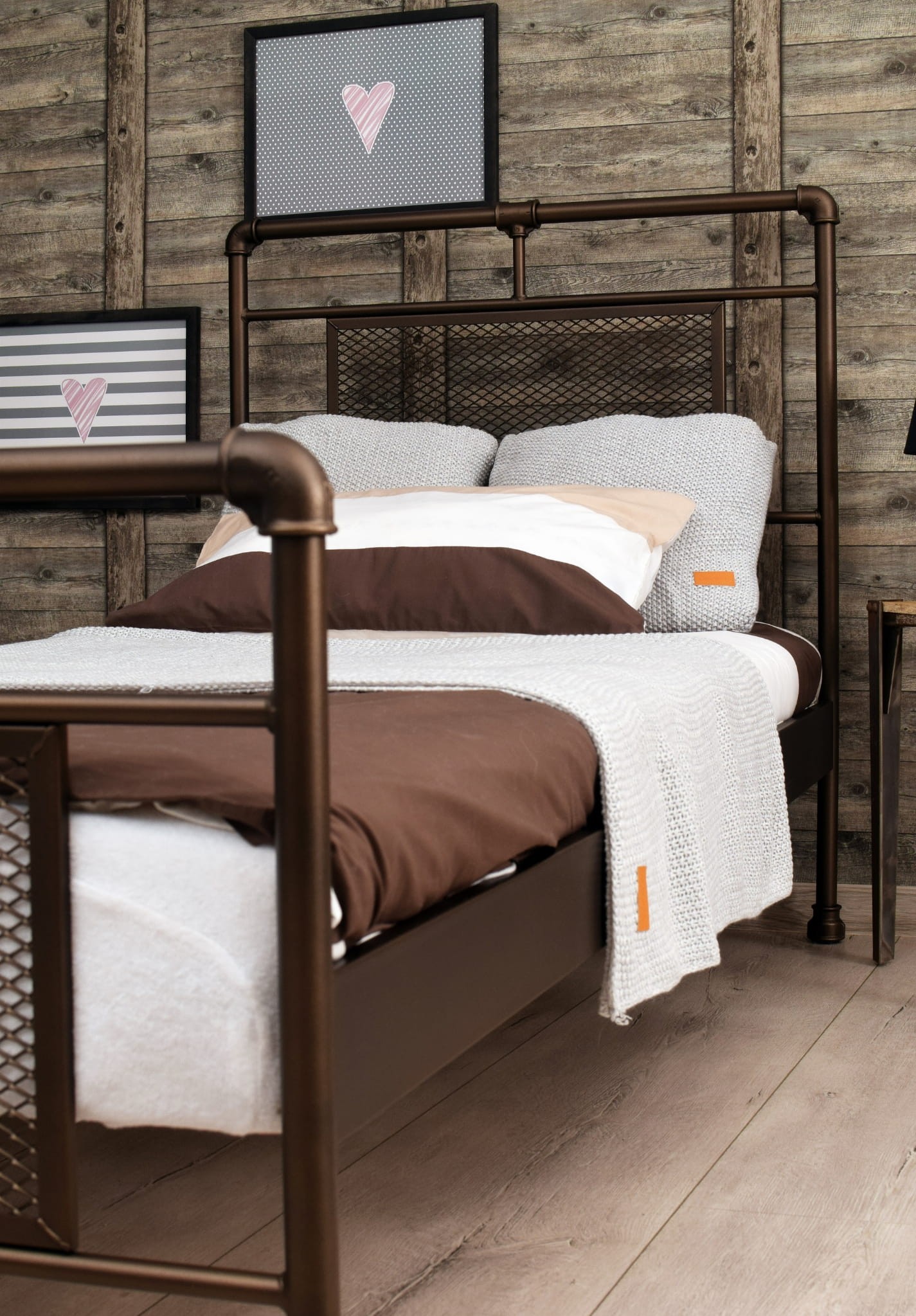 Na zdjęciach BELLUCZI Pojedyncze łóżko w stylu loftowym z elementów hydraulicznych w rozmiarze 90x200 cm w kolorze czekoladowy brąz metalik.