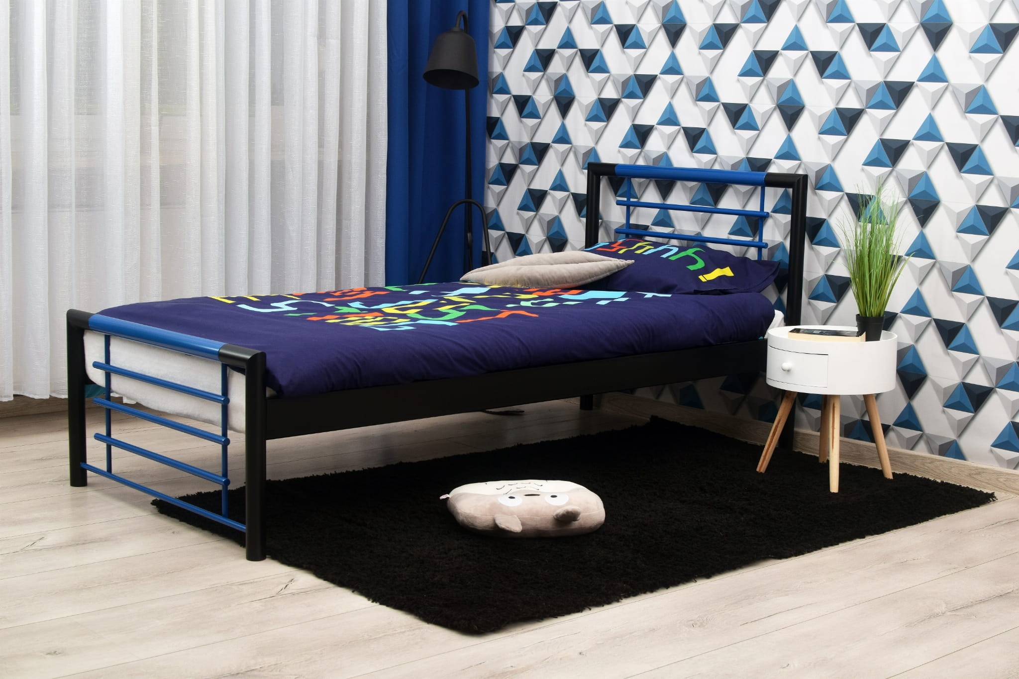 Połączenie czerni i niebieskiego nadaje mu świeży, nowoczesny wygląd, który doskonale sprawdzi się w pokoju młodzieżowym, ale również w sypialni osób ceniących prostotę i styl.