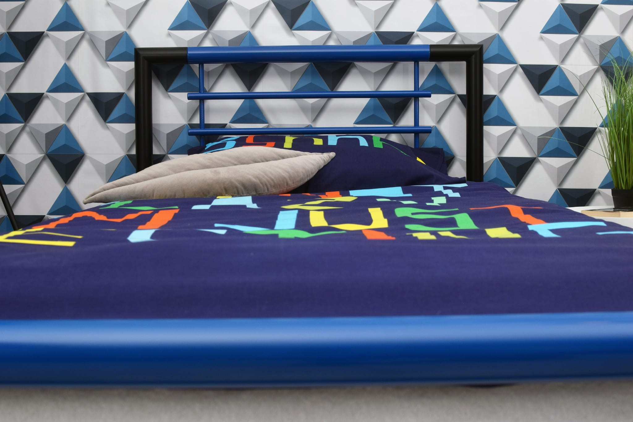 Black and Blue to nowoczesne łóżko metalowe, które łączy minimalistyczną formę z wyrazistym akcentem kolorystycznym.