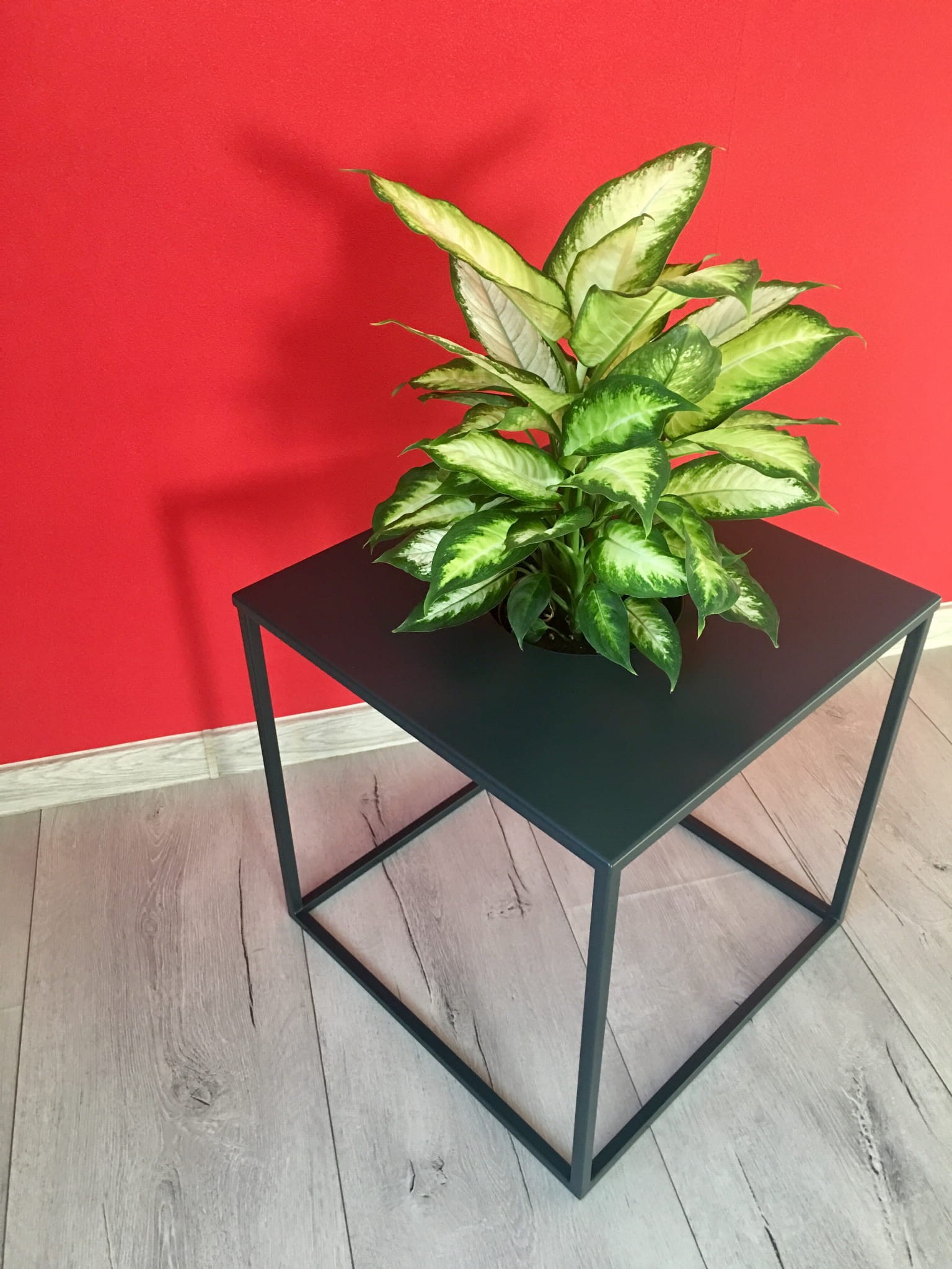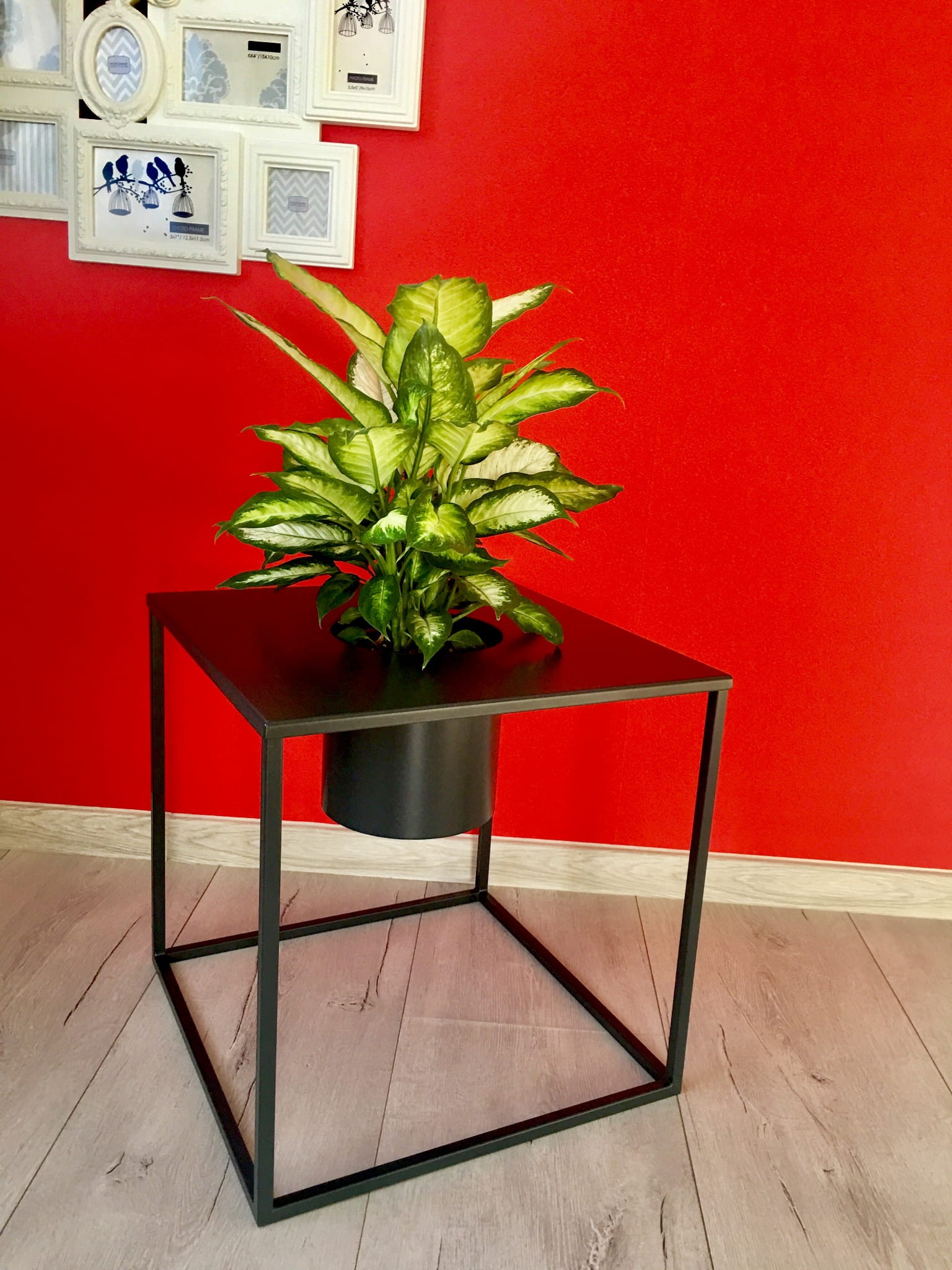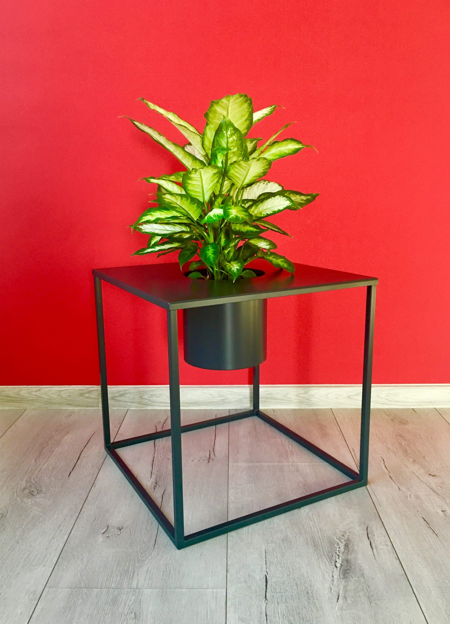 Kwietnik, wykonany jest z metalu, malowany proszkowo w kolorze grafitowym, ale śmiało można go pomalować w każdym kolorze dostępnym w palecie kolorów Ral, doniczka czy wazon wkładane są do środka, co daje nie tylko nowoczesny wygląd, ale i bezpieczeństwo dla rośliny i otoczenia.