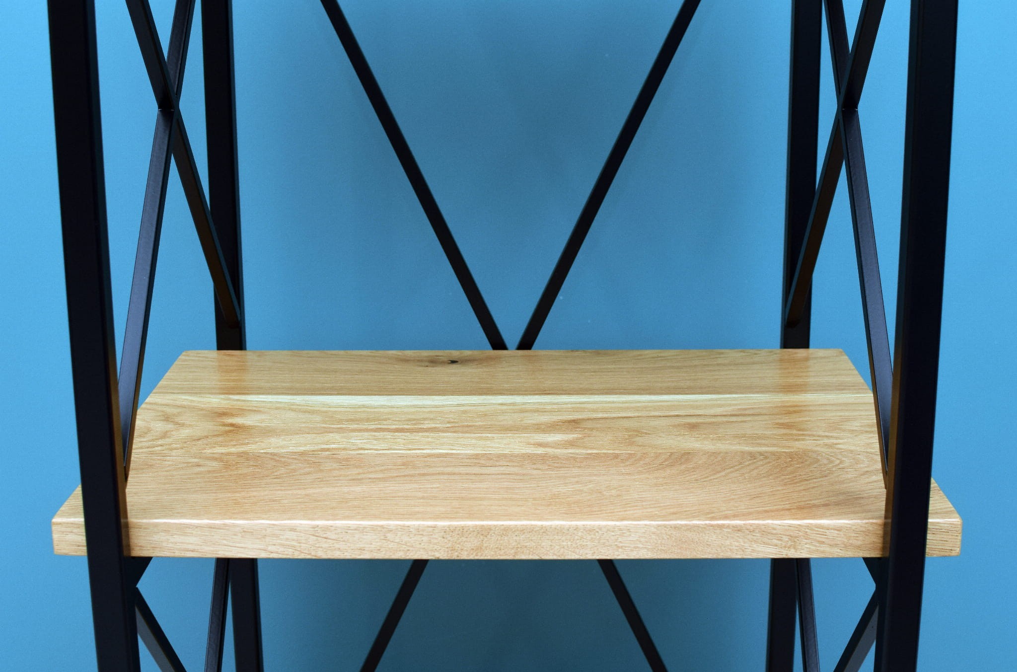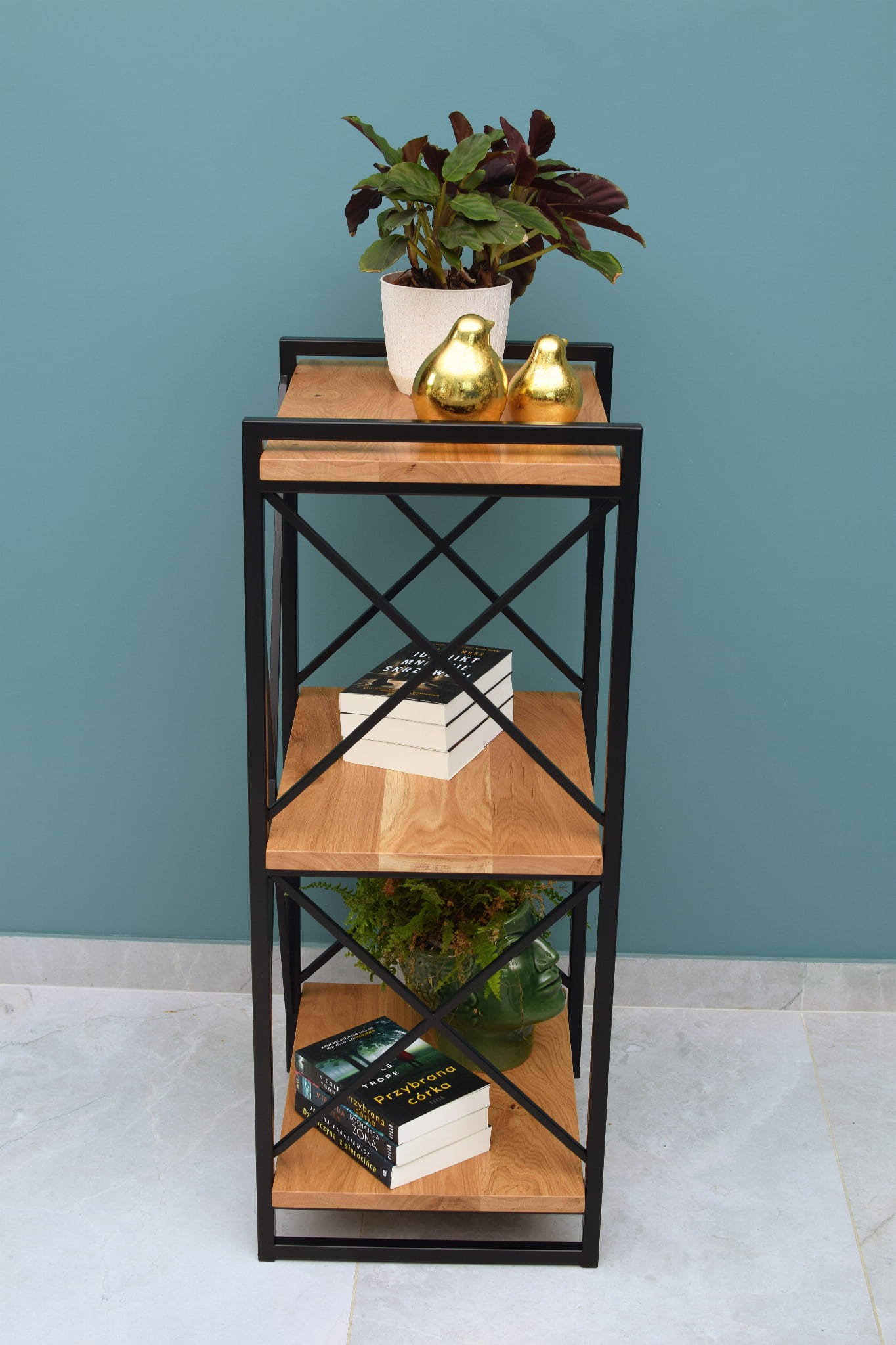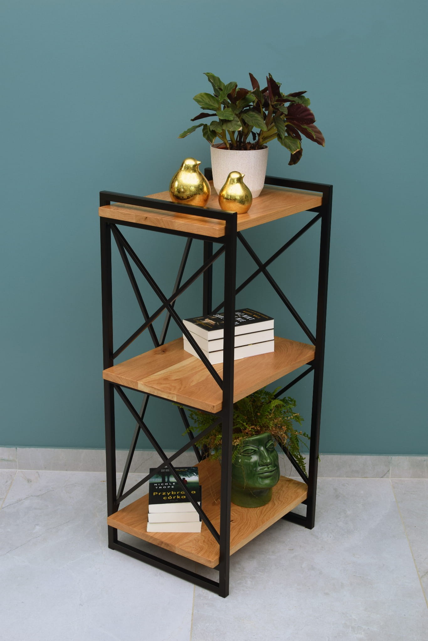 - Naturalne drewno: Półki wykonane z drewna dębowego dodają ciepła i elegancji, kontrastując z chłodnym metalem i nadając regałowi unikalny charakter.