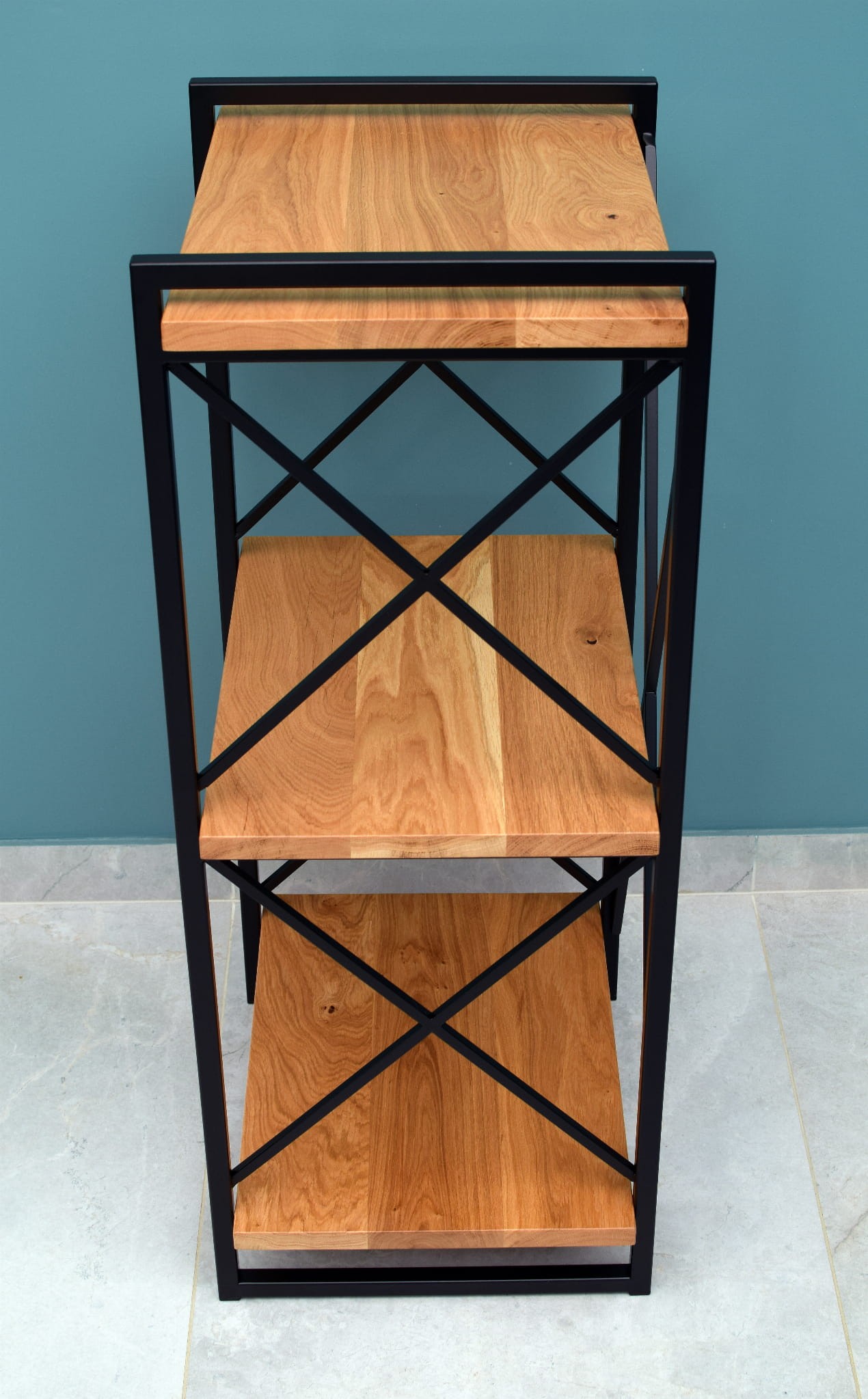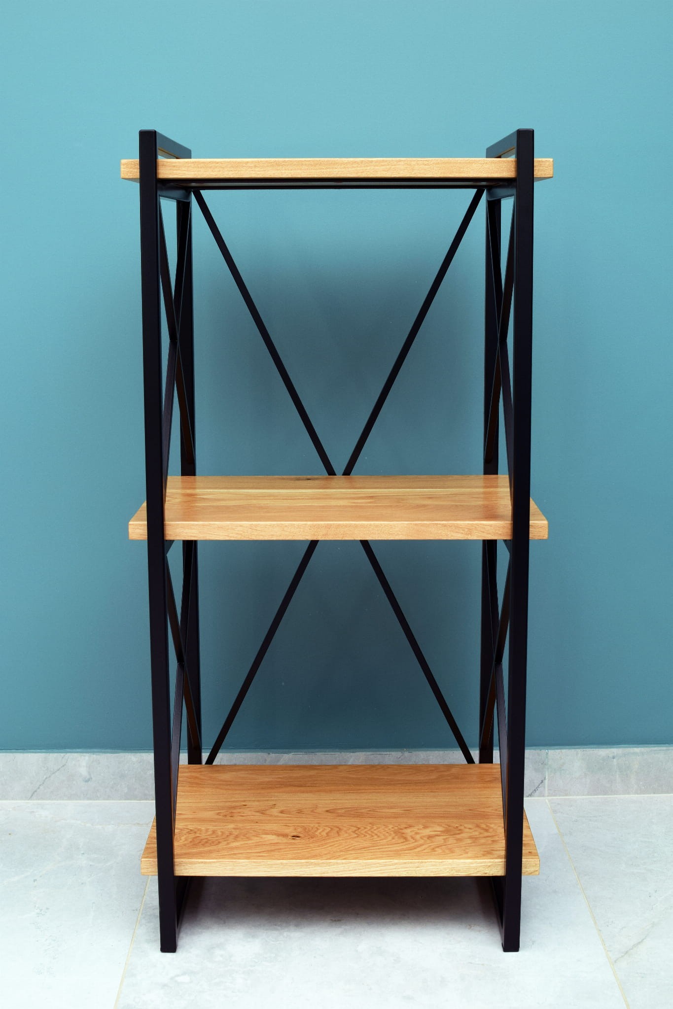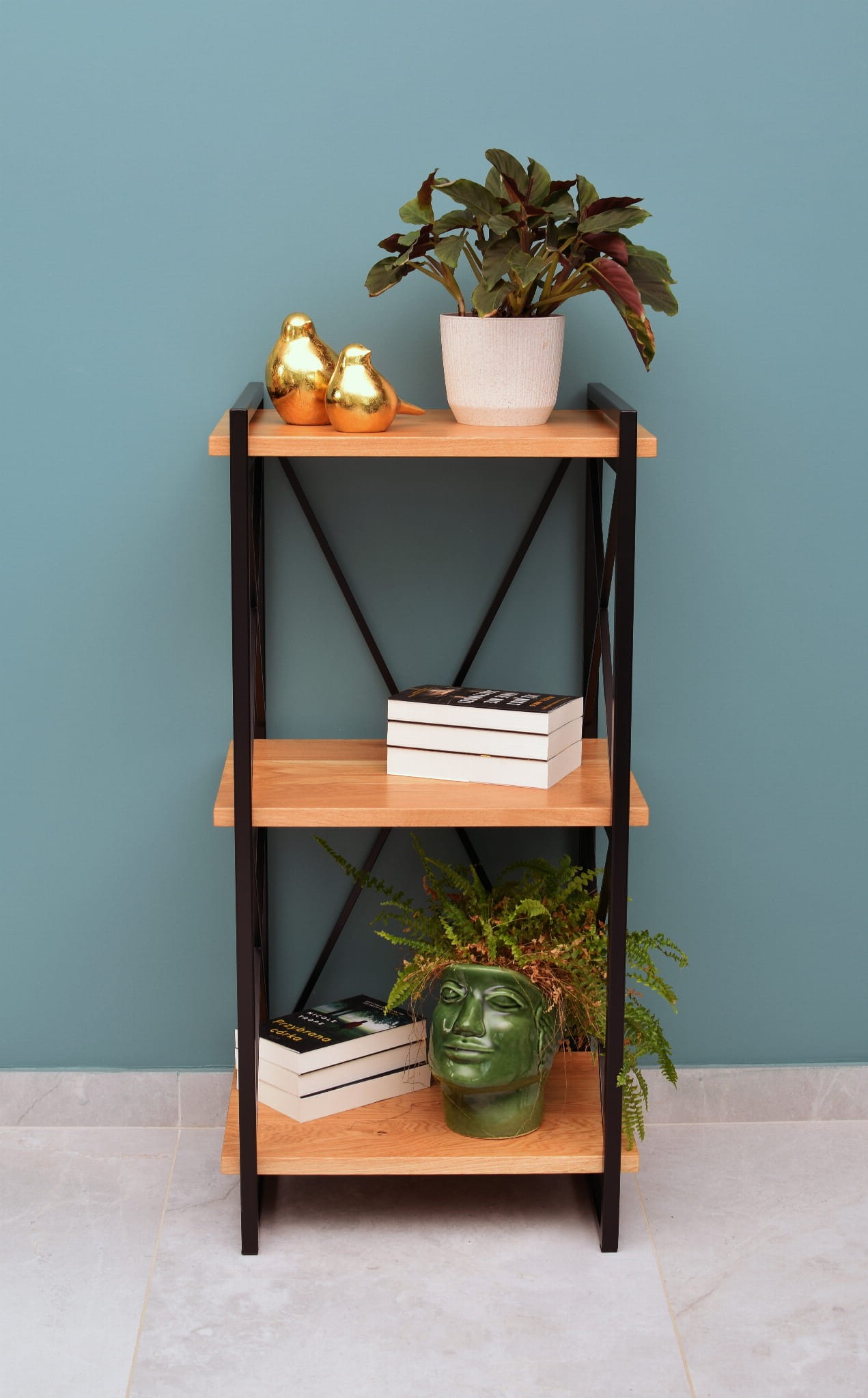 - Naturalne drewno: Półki wykonane z drewna dębowego dodają ciepła i elegancji, kontrastując z chłodnym metalem i nadając regałowi unikalny charakter.