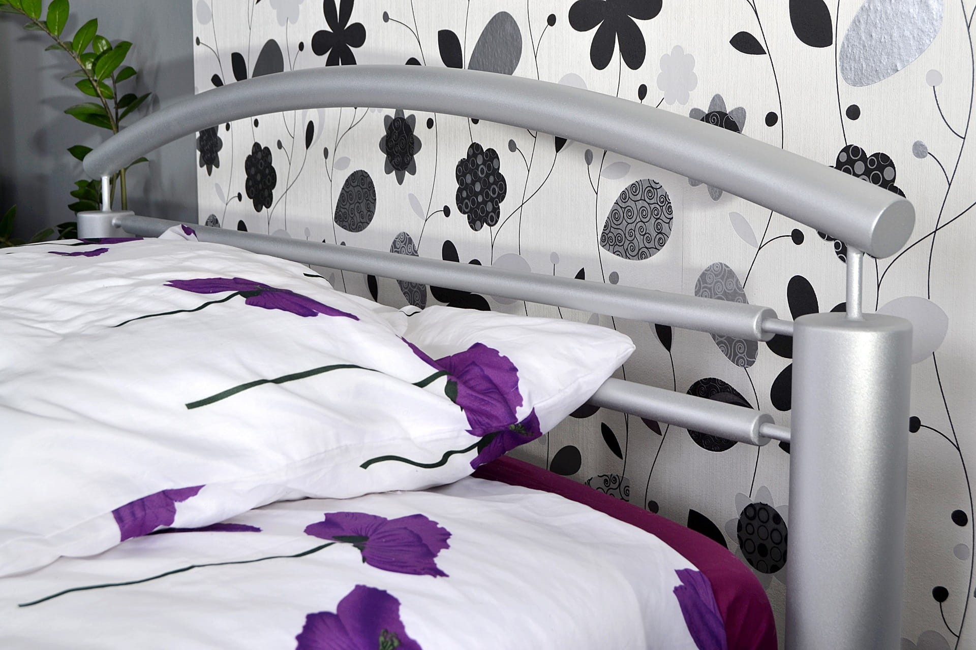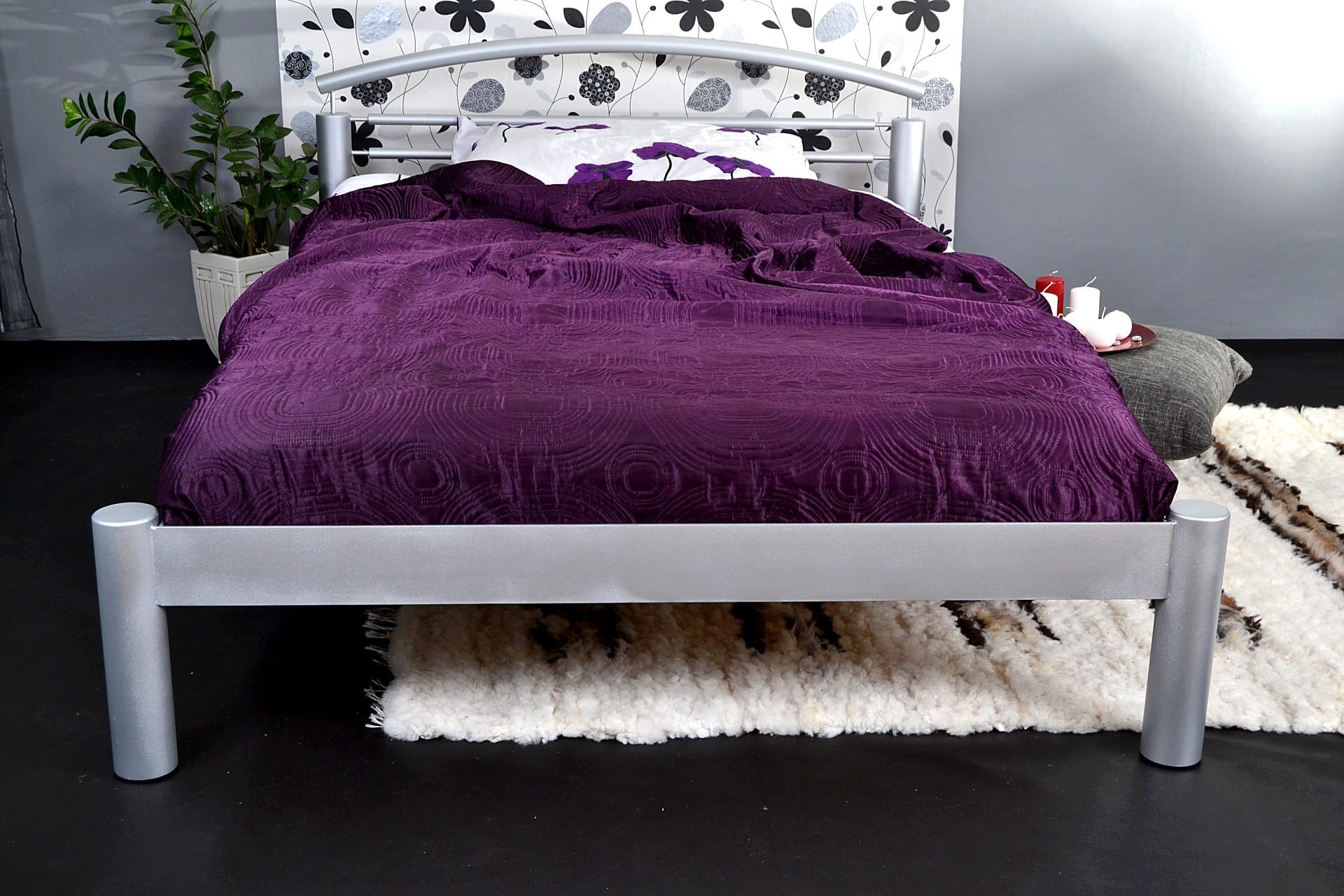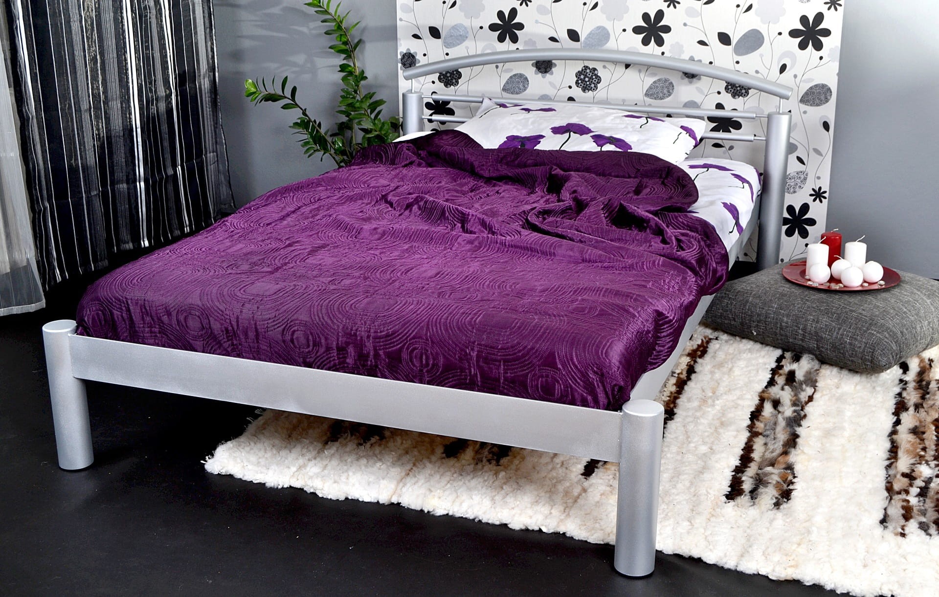 Na zdjęciu Masywne łóżko metalowe Łuna w rozmiarze 140x200 cm w kolorze srebrnym