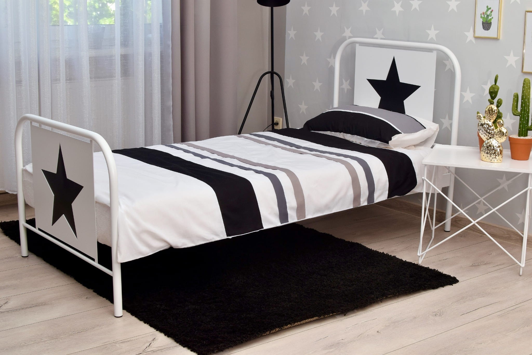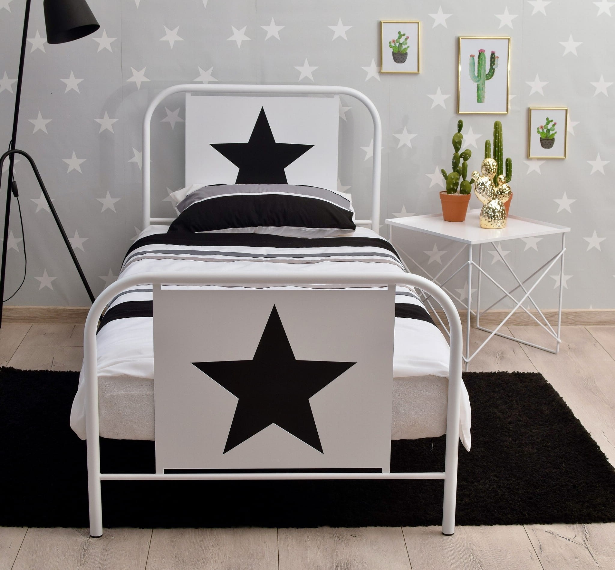 Łóżko wykonane jest ręcznie, na kształt dawnych, niezwykle modnych teraz łóżek "szpitalnych", gwiazda wycięta laserem, całość malowana proszkowo. Łóżko posiada drewniany sprężysty stelaż oraz plastikowe korki, zabezpieczające podłogę. Solidna, nieskrzypiąca, metalowa rama łóżka zapewnia komfortowy sen. Łóżko skręcane jest na śruby wszystkie elementy potrzebne do złożenia łóżka znajdują się w paczce.