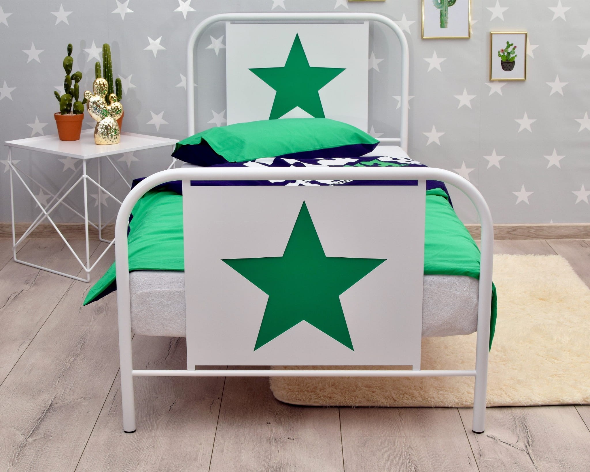 Łóżko wykonane jest ręcznie, na kształt dawnych, niezwykle modnych teraz łóżek "szpitalnych", gwiazda wycięta laserem, całość malowana proszkowo. Łóżko posiada drewniany sprężysty stelaż oraz plastikowe korki, zabezpieczające podłogę. Solidna, nieskrzypiąca, metalowa rama łóżka zapewnia komfortowy sen. Łóżko skręcane jest na śruby wszystkie elementy potrzebne do złożenia łóżka znajdują się w paczce.