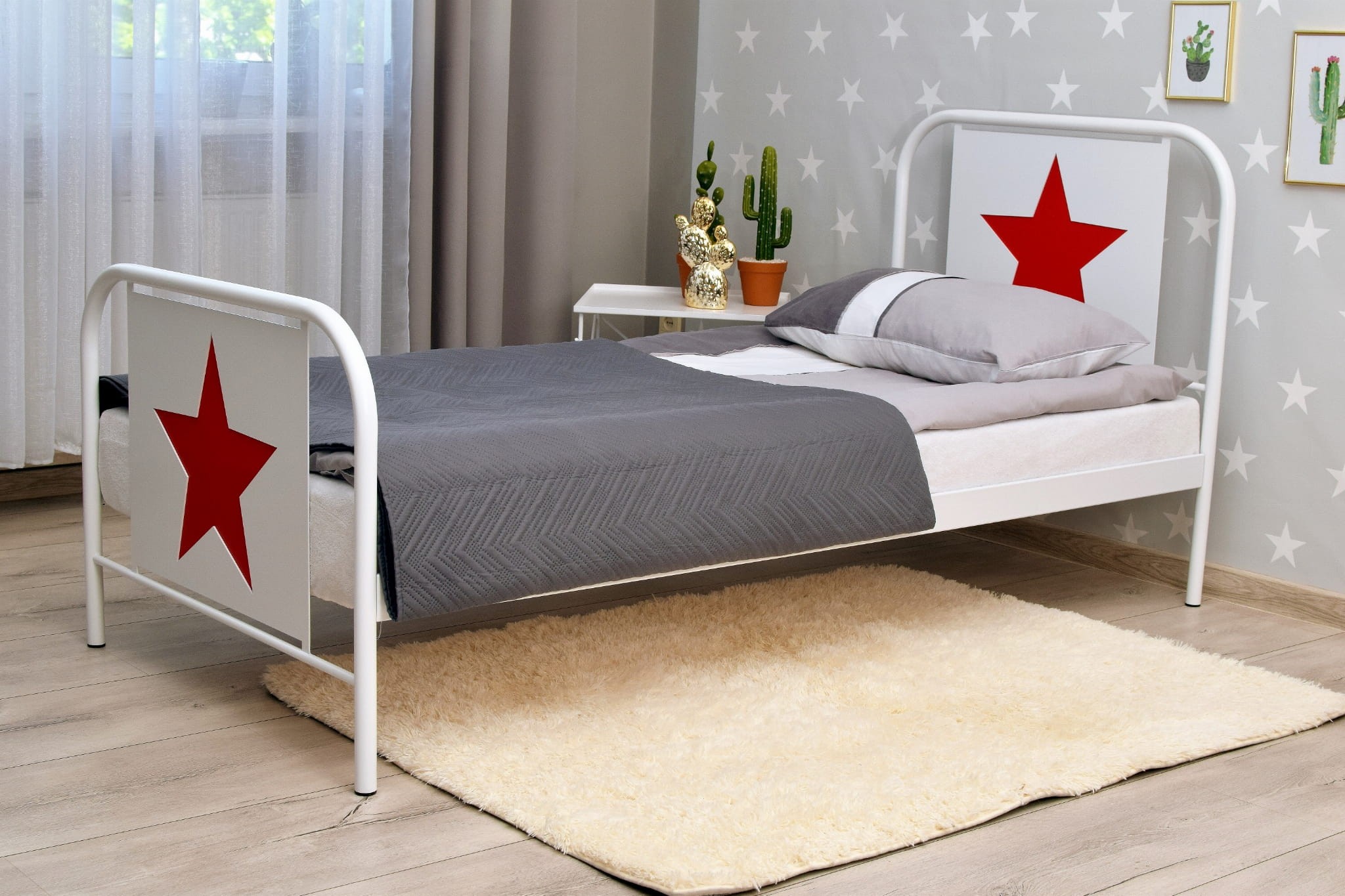 Łóżko wykonane jest ręcznie, na kształt dawnych, niezwykle modnych teraz łóżek "szpitalnych", gwiazda wycięta laserem, całość malowana proszkowo. Łóżko posiada drewniany sprężysty stelaż oraz plastikowe korki, zabezpieczające podłogę. Solidna, nieskrzypiąca, metalowa rama łóżka zapewnia komfortowy sen. Łóżko skręcane jest na śruby wszystkie elementy potrzebne do złożenia łóżka znajdują się w paczce.