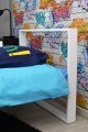 Młodzieżowe łóżko metalowe Mini Q doposażyć możesz w drewniany, pracujący stelaż, nogi zabezpieczone nakładkami dzięki czemu nie niszczą paneli podłogowych, łóżko skręcane jest na śruby do samodzielnego montaży.