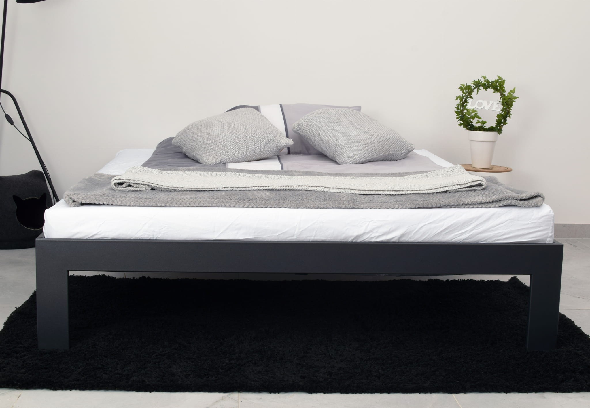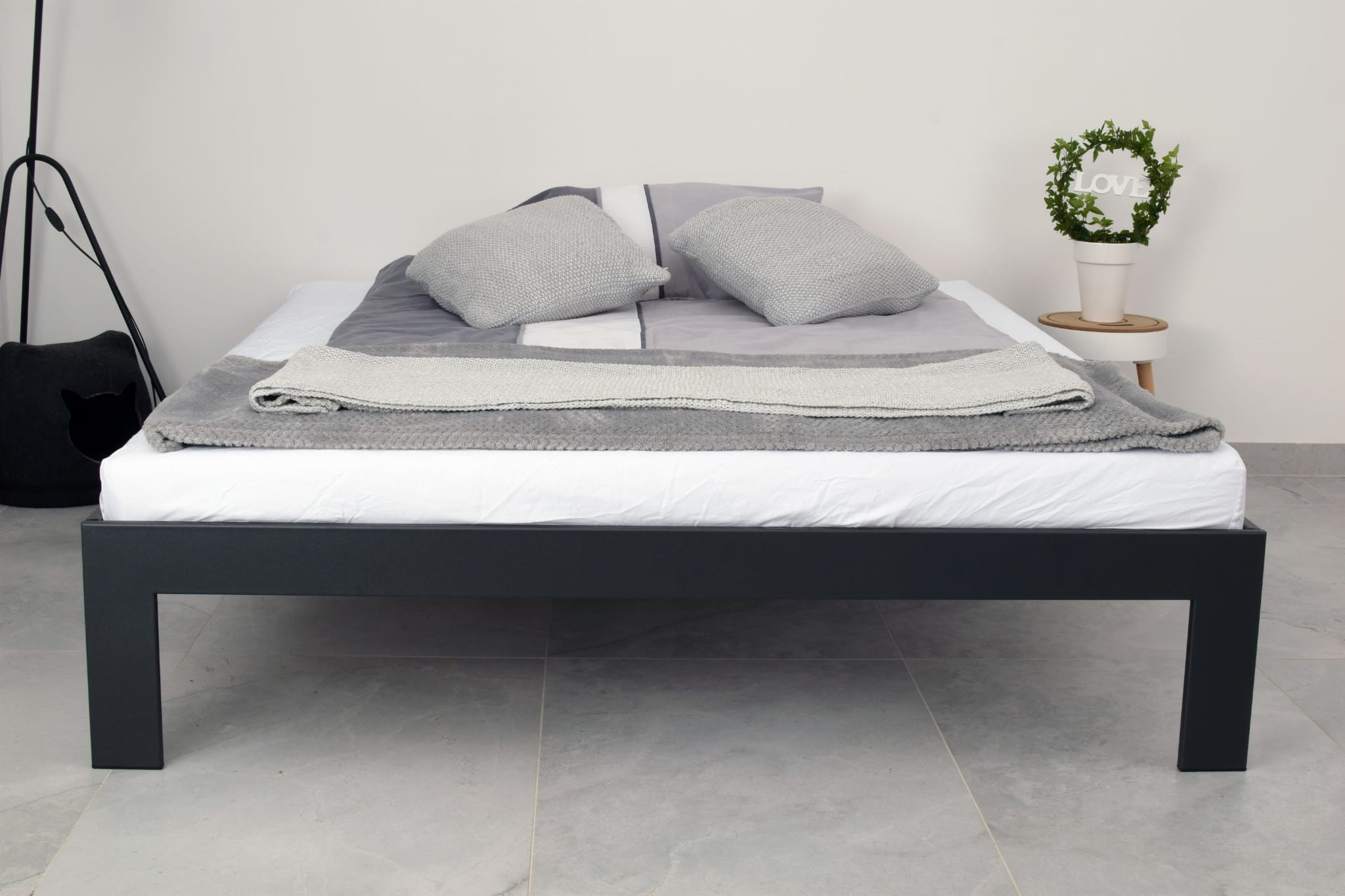 Wykonane ręcznie z dbałością o każdy detal, solidne łóżko metalowe Platforma zostało pomalowane nietoksycznymi farbami proszkowymi i skręcane śrubami. Do łóżka dołączony jest stelaż z elastycznych listw, zapewniający optymalne wsparcie dla materaca.