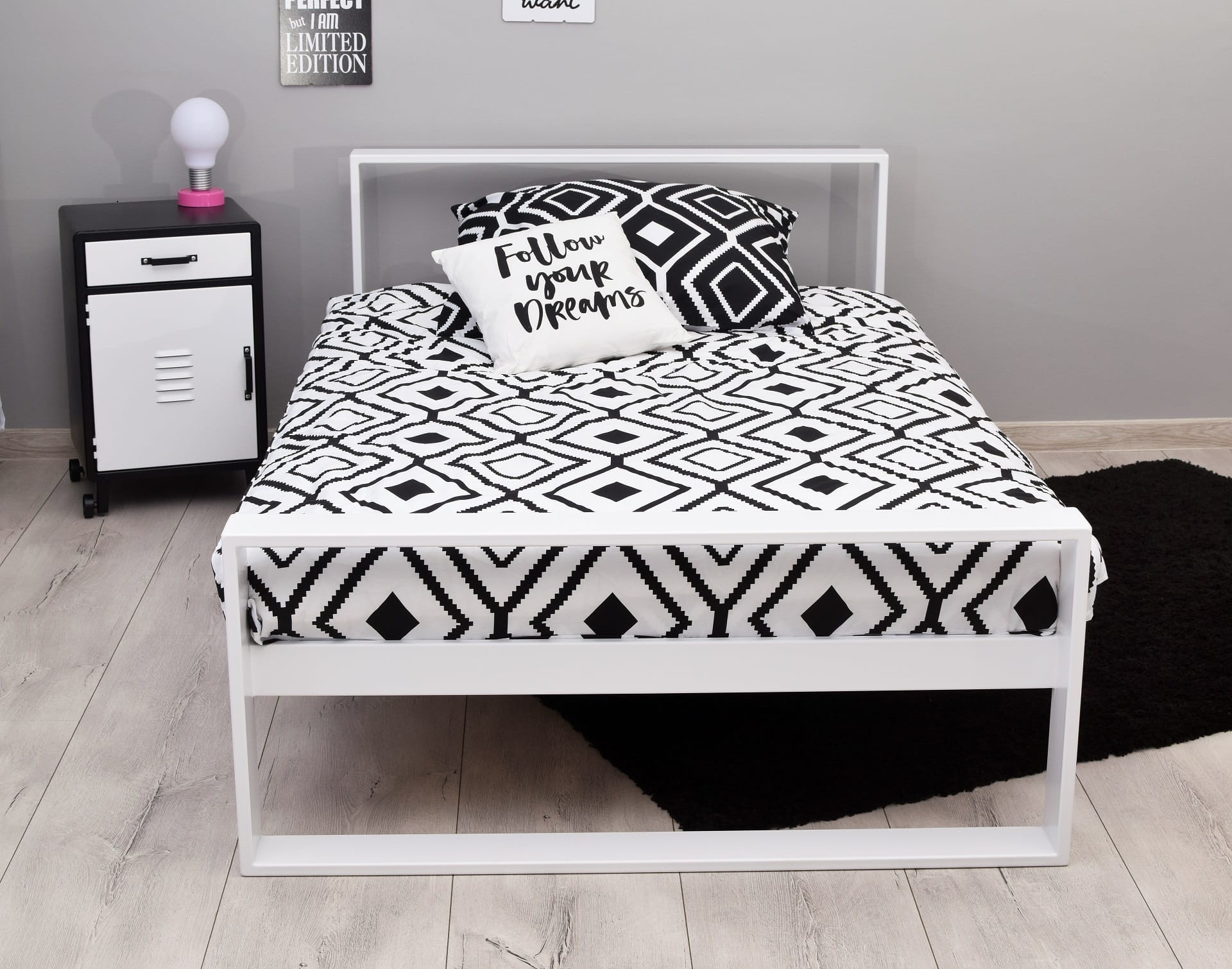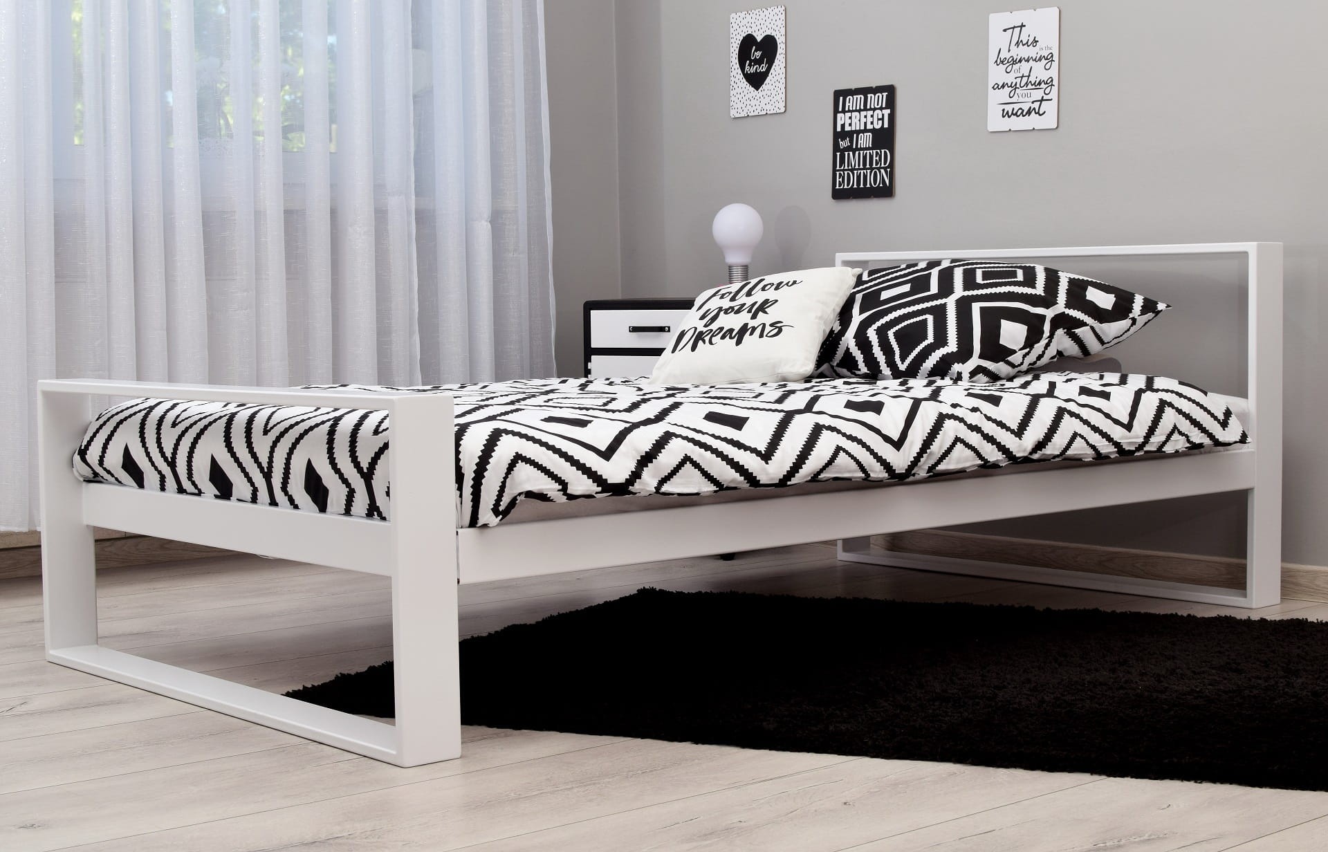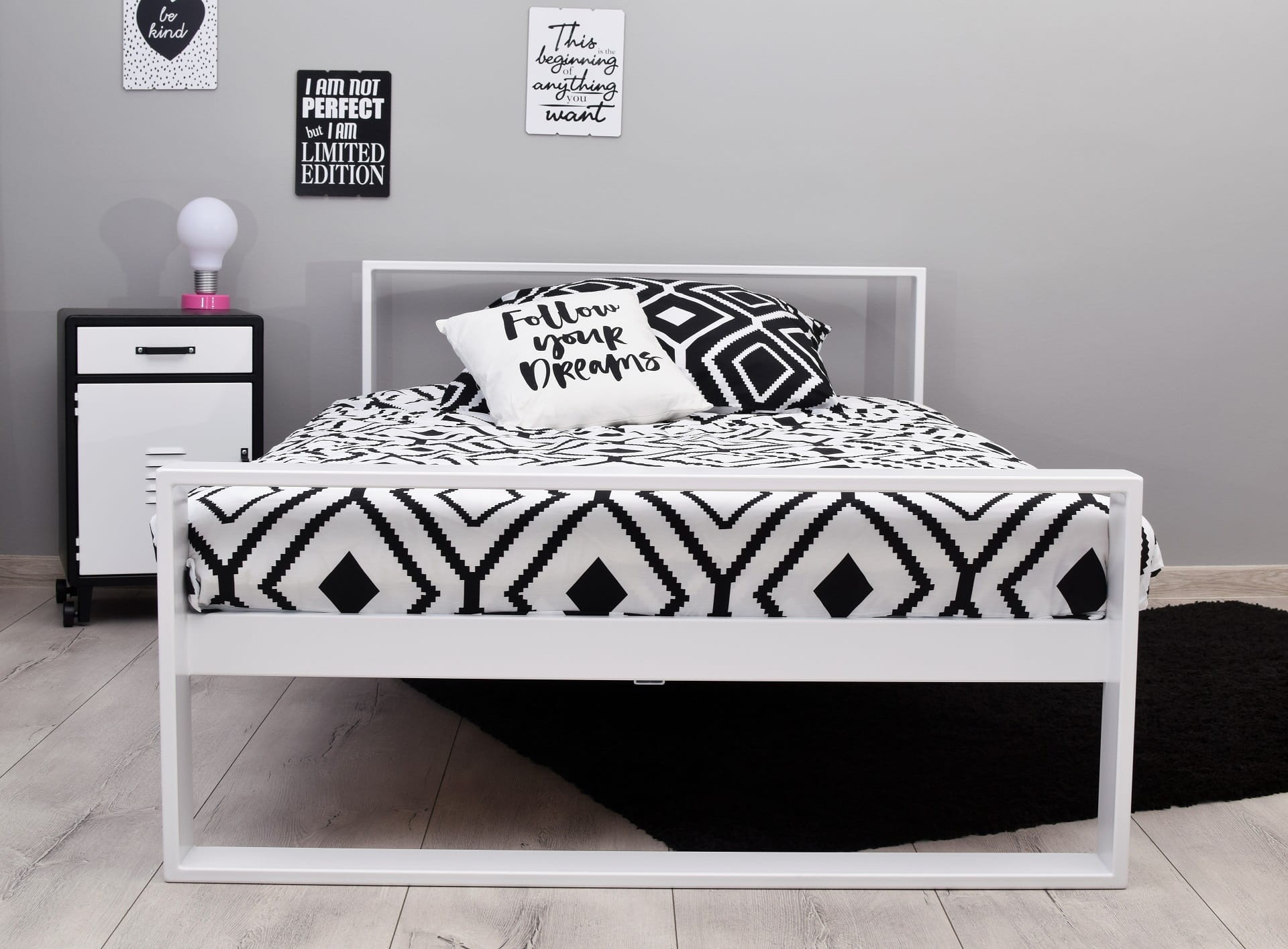 - Pojedyncze łóżko metalowe Maxi Q w odważnych kolorach doskonale sprawdza się w nowoczesnych wnętrzach.