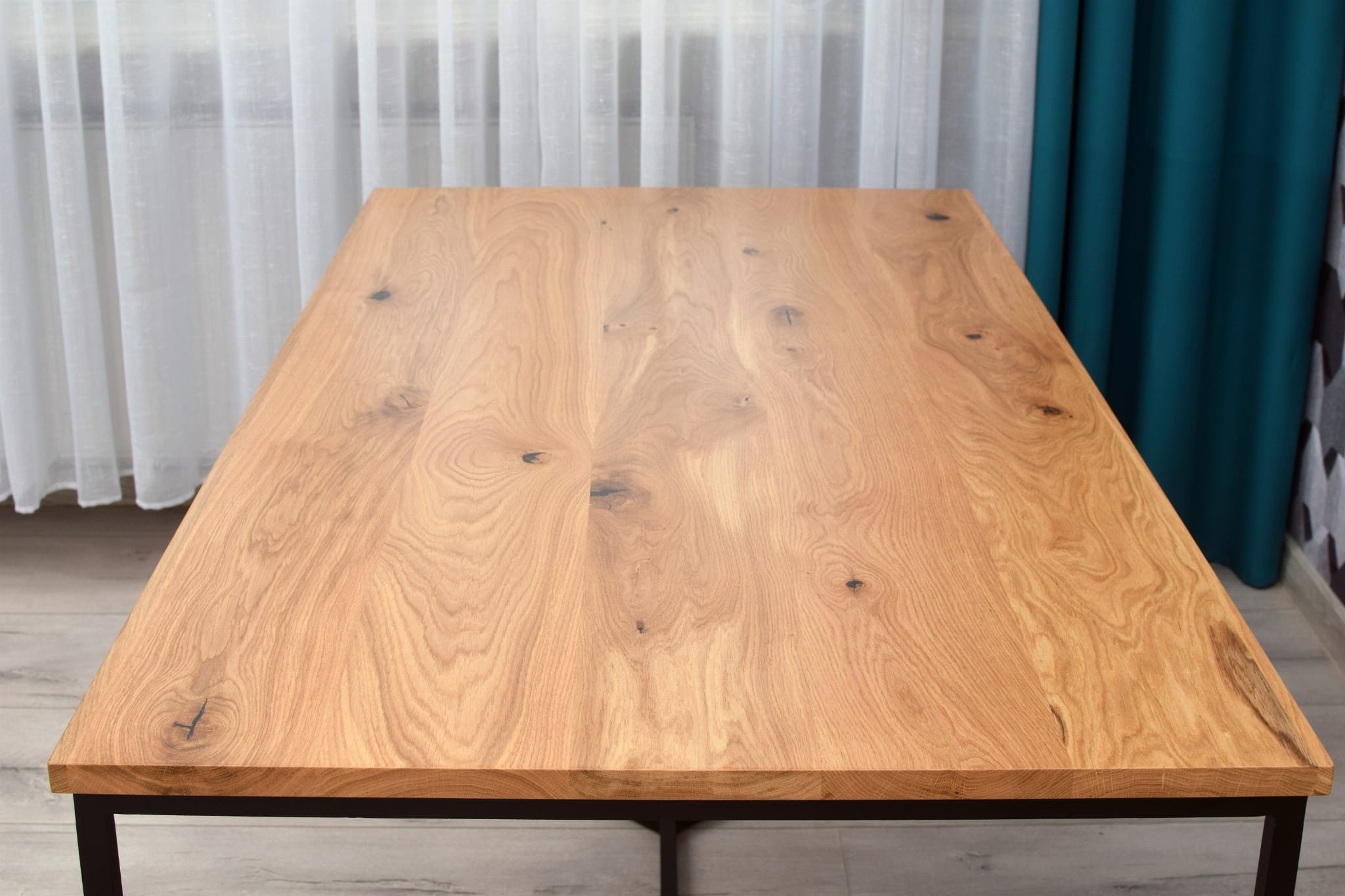 RUSTI Dębowy stół do jadalni w stylu industrialnym, to niezaprzeczalnie ozdobny element salonu czy jadalni. Piękny blat z litego dębowego drewna, z pięknie podkreślonymi słojami, to jest to na co postawiliśmy w tym projekcie. Ciekawe nogi, wykonaliśmy z pełnego pręta, po to by wizerunkowo były bardzo lekkie, a jednocześnie dawały bardzo stabilną podstawę. Każdy element tego dębowego stołu jest przez nas w pełni przemyślany.